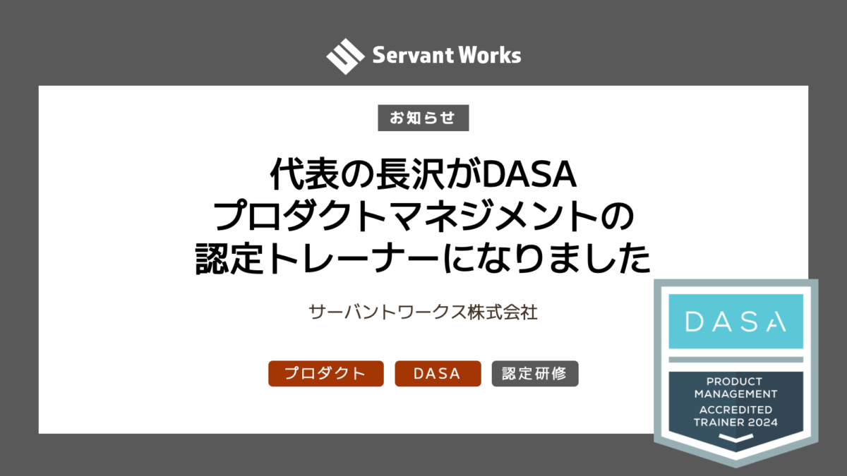 サーバントワークス株式会社(以下、弊社)は代表取締役の長沢智治が、DASA(DevOps Agile Skills Association)が提供する「DASAプロダクトマネジメント(DASA Product Management)」認定研修の認定トレーナー(Accredited Trainer)に任命されたことをご報告いたします。