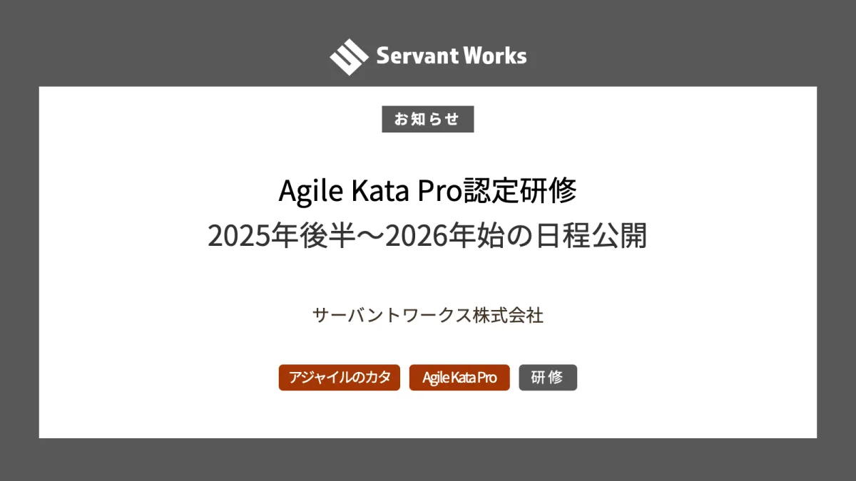 サーバントワークス株式会社は、Agile Kata Pro認定研修(認定試験付き)の2025年後半から2026年年始までのオープン研修の日程を公開いたしました。本日より参加お申し込みいただけます。